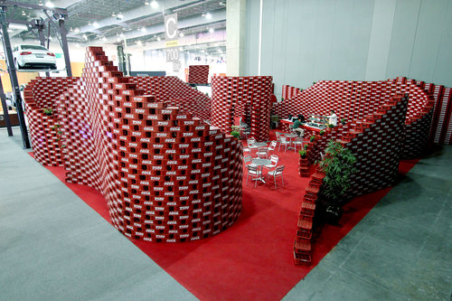 La solución que encontraron fue crear un stand a partir de algo reutilizable, de manera que el gasto fuese el mínimo posible, tanto antes como después del evento, además así también se ahorraban los gastos derivados de la generación de residuos. Partiendo de esto y del concepto material más sencillo y asentado en la construcción, el ladrillo o bloque simple, llegaron a la idea de utilizar cajas de botellas de vidrio para la construcción de todo el stand, tras llegar a esta idea se pusieron en contacto con la mayor empresa conocida de refrescos y esta, interesada en el proyecto, además de ofrecerles la materia prima y el patrocinio necesario se encargó de los gastos de transporte de las cajas.