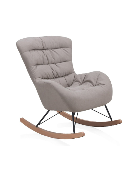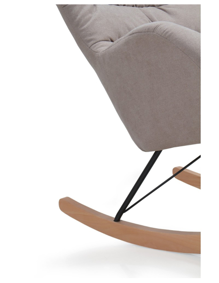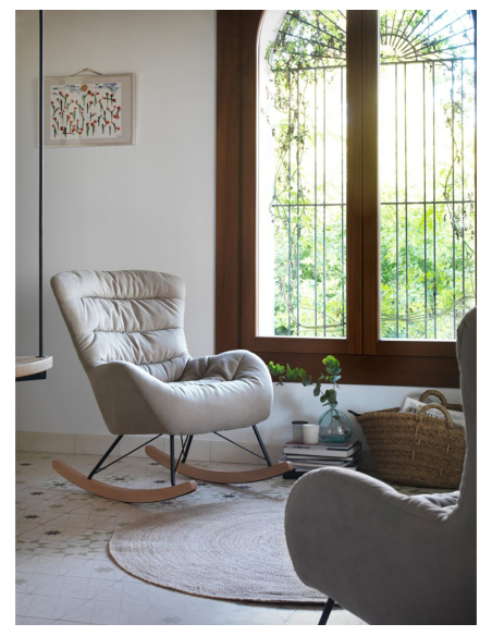 Mecedora Aliso tapizada beige deslizamiento madera, su diseño contemporáneo presenta un generoso acolchado tanto en el asiento como en el respaldo, con un efecto "puffy" o de almohadones integrados, tapizado en una agradable tela beige. La base combina patas metálicas negras con balancines curvos de madera de haya natural. Esta mecedora está pensada para el máximo relax. Su acolchado envolvente y su suave movimiento la convierten en el lugar ideal para leer, descansar o acunar a un bebé. El diseño, aunque confortable, mantiene unas líneas modernas y se adapta bien a diferentes estilos decorativos. Perfecta para salones, dormitorios o cuartos infantiles que busquen un asiento extra cómodo y con un diseño actual. La mecedora Aliso te ofrece un refugio de tranquilidad con estilo.