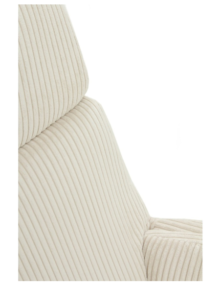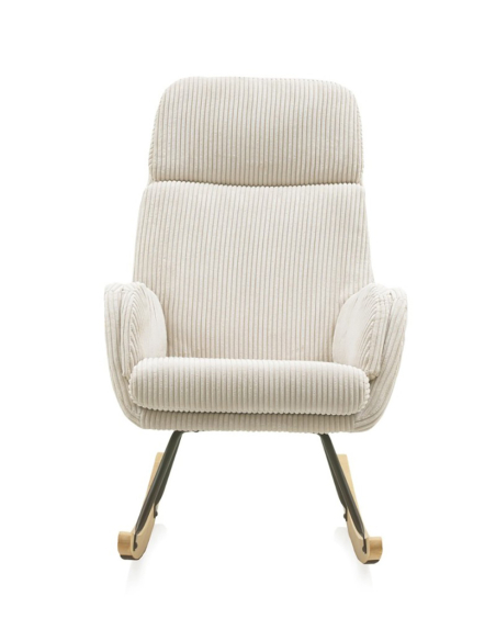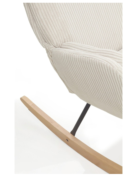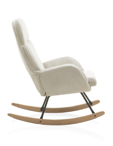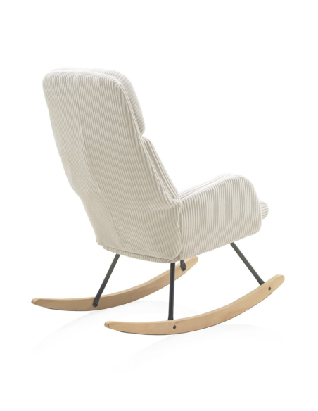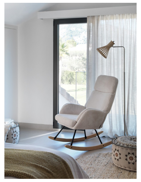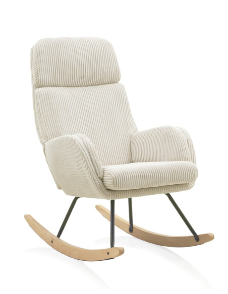 Mecedora balancín Aliso tapizado blanco, su tejido, una suave y resistente pana gruesa de poliéster, ofrece una textura acogedora y muy agradable al tacto. El diseño combina un respaldo alto ergonómico con la base de metal negro y balancines de madera de haya. Esta mecedora es una invitación al relax total. Su generoso acolchado y el suave balanceo te envolverán en una sensación de bienestar, ideal para leer, descansar o acunar. El color blanco aporta frescura y luminosidad, haciendo que la pieza encaje perfectamente en ambientes claros y serenos. Perfecta para salones, dormitorios o cuartos de bebé de estilo escandinavo, moderno o contemporáneo. La mecedora Aliso en blanco combina un confort excepcional con un diseño limpio, texturizado y lleno de luz.