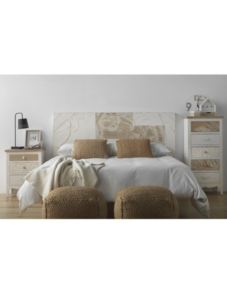 Cabecero cama Siroco pared 145 x 60 cm, este panel decorativo combina la calidez de la madera de abeto natural con secciones en blanco lavado, sobre las que destacan delicados relieves tallados con motivos de hojas tropicales. El resultado es un efecto patchwork texturizado y lleno de encanto. Su diseño horizontal y su formato de panel lo hacen ideal para colgar fácilmente en la pared, creando un punto focal sereno y evocador detrás de la cama. La combinación de la madera vista y los relieves blancos aporta luminosidad y un aire fresco y natural. Perfecto para dormitorios de estilo bohemio, costero, tropical o natural, este cabecero añade personalidad y un toque artesanal único. Viste tu cama con la belleza de los materiales naturales y un diseño que invita a la relajación.