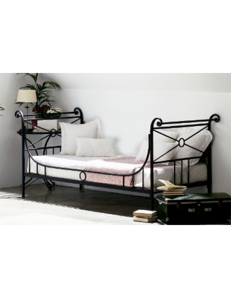 Diván de forja Atenas para colchón de 90x190 cm, una pieza que combina la funcionalidad de un asiento con la elegancia de un diseño clásico. Este diván de forja se caracteriza por sus líneas curvas y sus detalles ornamentales, que evocan la sofisticación de épocas pasadas. Los remates en forma de voluta en los extremos añaden un toque de distinción y personalidad. El respaldo, con su diseño abierto y ligero, proporciona un soporte cómodo sin sobrecargar el espacio. La estructura de metal, con su acabado oscuro, garantiza durabilidad y resistencia, mientras que su diseño versátil permite que se integre fácilmente en cualquier ambiente. Perfecto para salones, dormitorios o incluso recibidos, este diván es una invitación a relajarse y disfrutar de un momento de tranquilidad. Su presencia añade un toque de elegancia y carácter a cualquier espacio. Su estructura de metal, además de ser muy sólida, es visualmente liviana, por lo que se adapta a espacios reducidos.