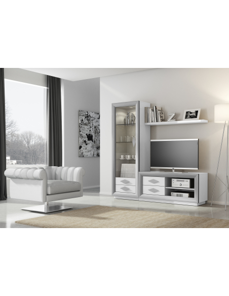 Composición de salón modelo CLOE compuesto por: mueble de TV, estante y vitrina alta una puerta con cajones.
