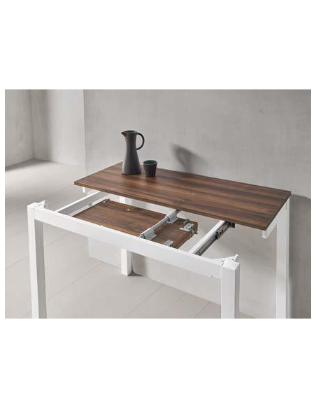 Mesa de Cocina Cristal Zara Frontal con apertura frontal con desplazamiento de patas guías telescópicas y un extensible de 30 cm en laminado a juego con el armazón. Personalizable en medidas y acabados.