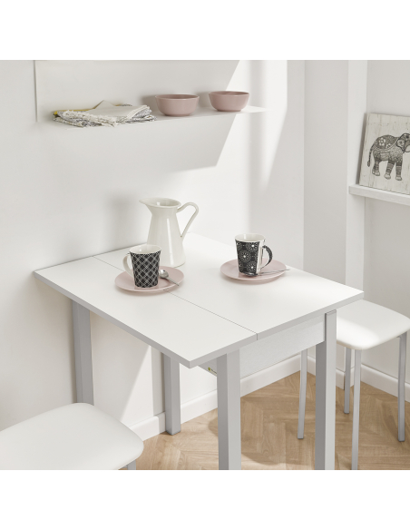 Mesa de Cocina Laminado Bayona Abatible con apertura abatible con una extensión de 20 cm con laminado en color blanco. Patas metálicas de 4 x 4 cm.