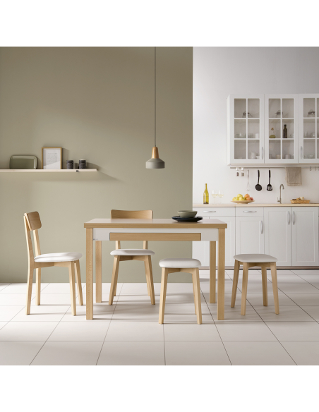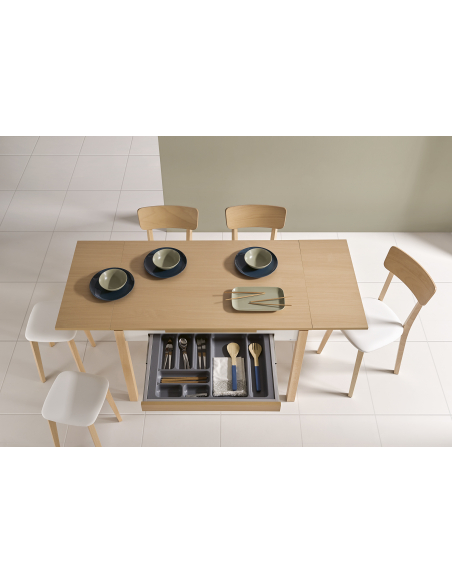 Mesa de Cocina Laminado Delta Extensible con apertura lateral con dos extensiones de 30 cm en laminado a juego con la encimera y guías automáticas. Opción de añadir cubertero de PVC o madera de Haya y fabricar en medidas especiales. Contactar para más información sobre estos accesorios.