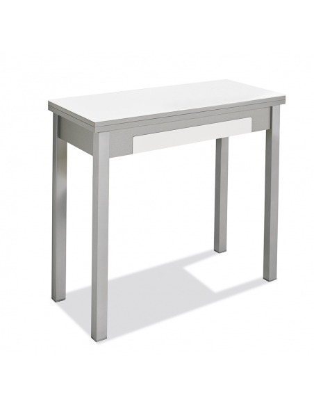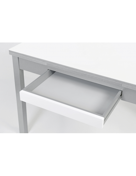 Patas metálicas acabado en Blanco, Negro o Aluminio. Armazón laminado en Aluminio y encimera y frente cajón laminada en Blanco.