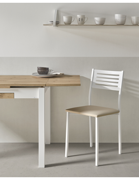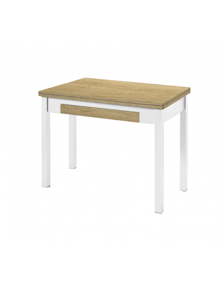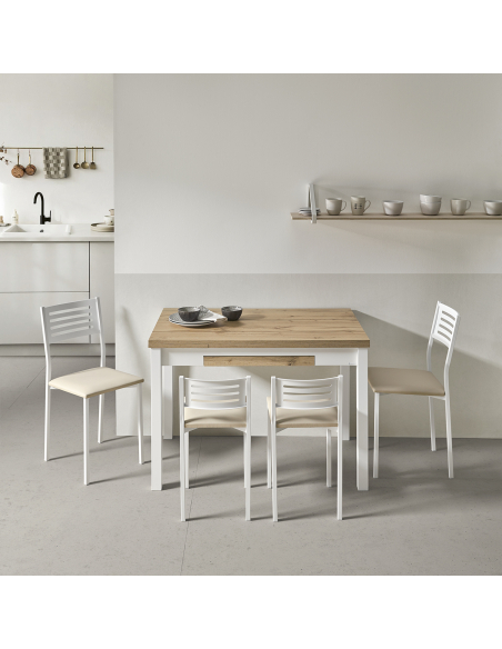 Mesa de Cocina Laminado Nube Extensible con apertura por los laterales con dos extensiones en laminado de Roble Hércules y guías manuales. Patas metálicas de 5 x 5 cm. Personalizable en medidas y acabados.