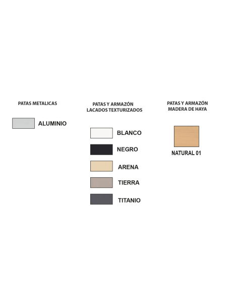 Patas y armazón metálicos en color Aluminio, lacados texturizados o acabado en Madera de Haya Natural.