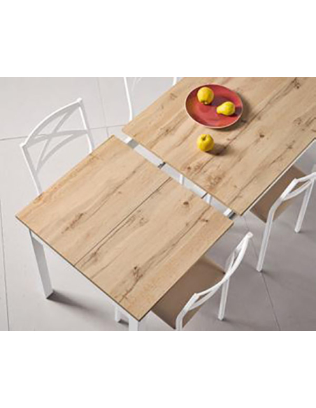 Conjunto de Mesa de Cocina Laminado Atenas Extensible y 4 sillas de cocina modelo Oca. Mesa con apertura lateral con desplazamiento de patas y un extensible de 60 cm laminado a juego con la encimera y patas metálicas de 5x5 cm con ruedas en la parte extensible para facilitar el desplazamiento.