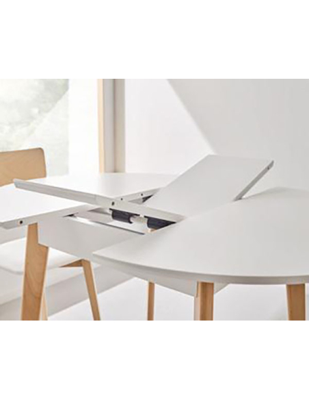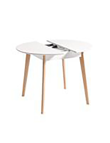 Mesa de cocina redonda extensible con patas oblicuas en madera de haya color natural, armazón laminado en blanco y encimera en laminado blanco.