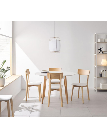 Conjunto de Mesa de Cocina redonda extensible Ana y 4 sillas de cocina modelo Zaida. Mesa extensible con armazón laminado en blanco y patas oblicuas en madera de haya.