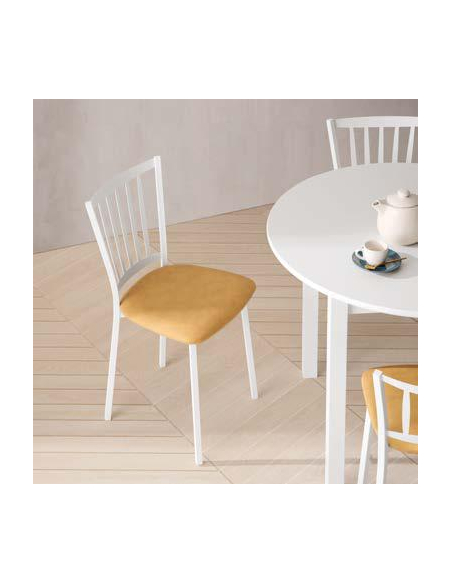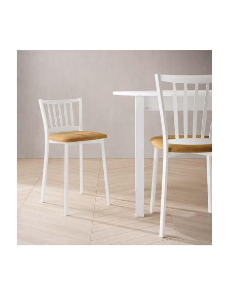Silla de Cocina Petra fabricado el armazón metálico con tubo cuadrado de 20 mm con opción de elegir el acabado en aluminio, blanco o negro. Asiento de polipiel con el acabado a elegir entre los ofrecidos en la carta de colores.