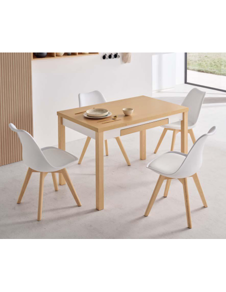 Mesa de Cocina Laminado Ibiza Extensible con apertura por los laterales con dos extensiones en laminado de Roble medio Hércules y guías manuales. Patas cuadradas en madera de haya de 5 x 5 cm. Personalizable en medidas y acabados.