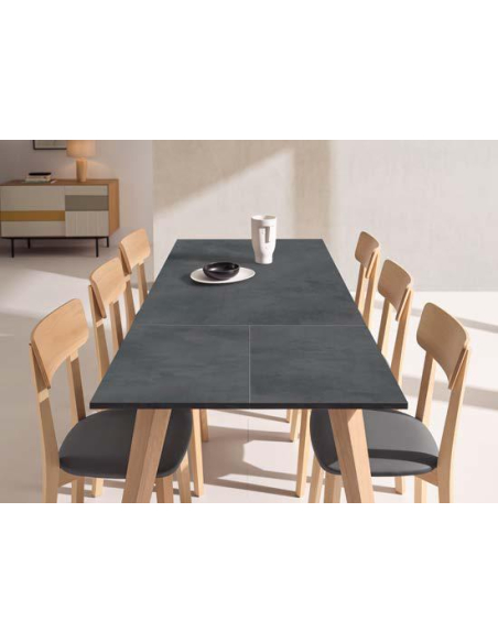 Mesa de Cocina Laminado Nora Fija con armazón reforzado en madera de Haya para dar estabilidad a la mesa. Patas macizas en madera de Haya. Personalizable en medidas y acabados.