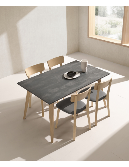 Mesa de Cocina Porcelánico Nora Fija con armazón reforzado en madera de Haya para dar estabilidad a la mesa. Patas macizas en madera de Haya. Personalizable en medidas y acabados.