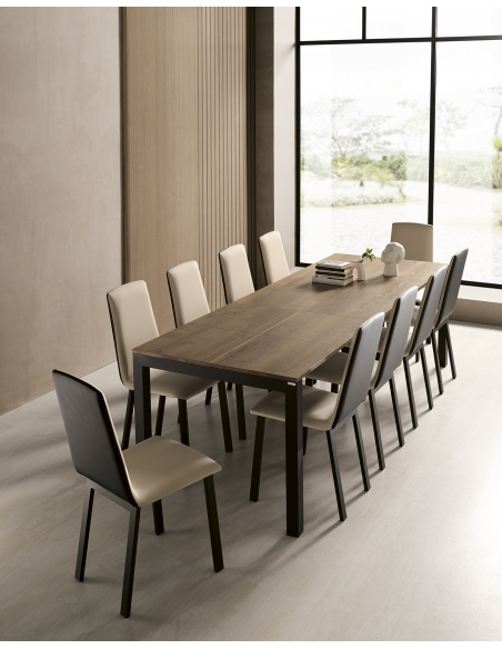 Mesa de Cocina Porcelánico Zumaya Extensible con armazón de aluminio y apertura lateral con desplazamiento de patas. Guías telescópicas con ruedas de nylon y dos extensiones de 50 cm en laminado a juego con el armazón. Patas de portería de 6 x 6 cm con ruedas en la parte extensible para facilitar la apertura por desplazamiento. Personalizable en medidas y acabados.