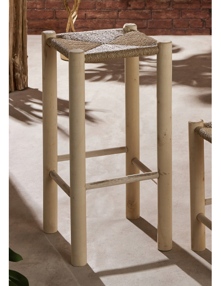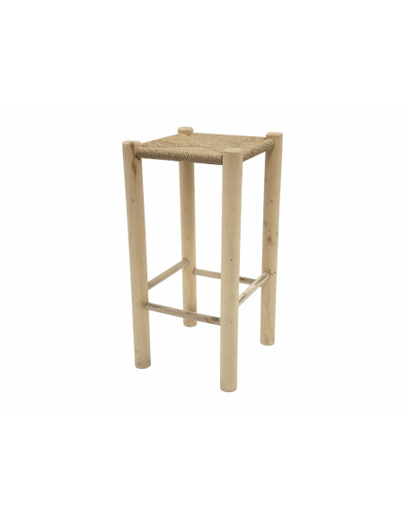 Taburete madera natural con asiento de cuerda 64cms, diseñado con cuatro patas robustas y un refuerzo en la base para mayor estabilidad. Su asiento, tejido de cuerda natural, no solo proporciona un confort excepcional, sino que también añade un encanto artesanal que complementa cualquier estilo de decoración. Ideal para cocinas, comedores o espacios exteriores, este taburete combina funcionalidad y estética, convirtiéndose en un elemento versátil que realza la calidez de tu hogar. Perfecto para quienes buscan una pieza duradera y con carácter, este taburete es una opción ideal para sentarse cómodamente o como apoyo decorativo.