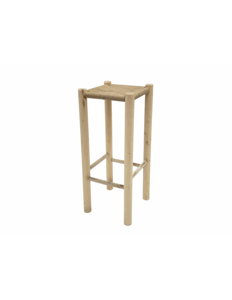 Taburete madera natural con asiento de cuerda 75cms, diseñado con cuatro patas robustas y un refuerzo en la base para mayor estabilidad. Su asiento, tejido de cuerda natural, no solo proporciona un confort excepcional, sino que también añade un encanto artesanal que complementa cualquier estilo de decoración. Ideal para cocinas, comedores o espacios exteriores, este taburete combina funcionalidad y estética, convirtiéndose en un elemento versátil que realza la calidez de tu hogar. Perfecto para quienes buscan una pieza duradera y con carácter, este taburete es una opción ideal para sentarse cómodamente o como apoyo decorativo.