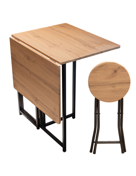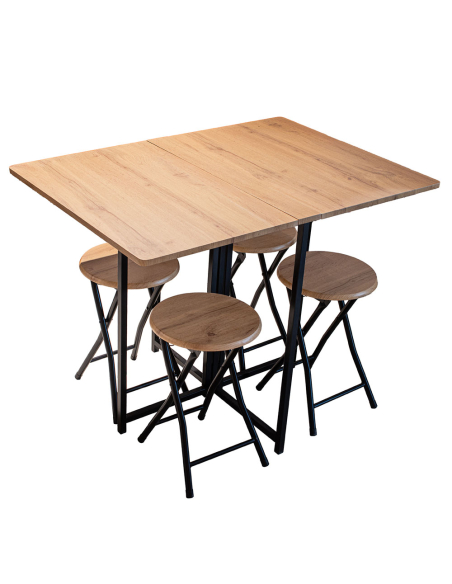 Set mesa plegable Kelly 4 taburetes, una solución versátil y moderna para hogares con espacios limitados. Este conjunto incluye una mesa plegable que se adapta a diferentes necesidades, desde comidas hasta trabajos o reuniones, y cuatro taburetes que pueden guardarse de manera compacta para optimizar el espacio. El diseño de la mesa, con un tablero en acabado de madera y estructura metálica negra, ofrece una combinación perfecta de funcionalidad y estilo. Este set es ideal para cocinas, estudios o apartamentos pequeños, brindando una solución práctica sin sacrificar la estética.