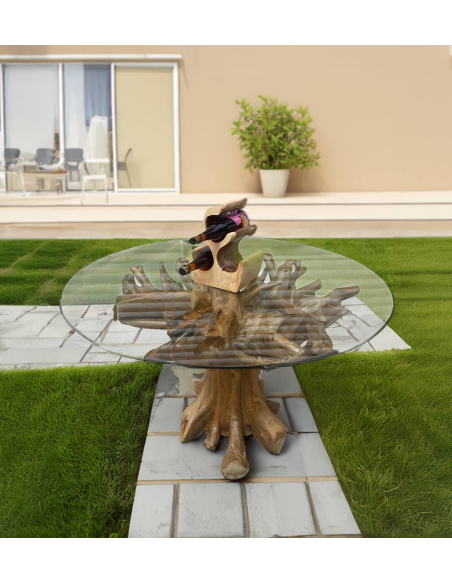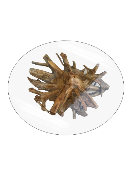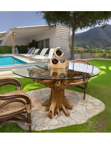 La mesa de comedor realizada en raíz de teka blanqueada, elegante y natural, llenará tu espacio de belleza a la par que de naturalidad. Sus formas sencillas sacadas del mismo árbol combinarán a la perfección con el resto de mobiliario y decoración que tengas en tu hogar, ya que sus formas naturales son muy versátiles y se adaptan a todos los estilos y ambientes. En su parte superior tiene un cristal de vidrio fácil de limpiar y cómoda para todos los comensales.