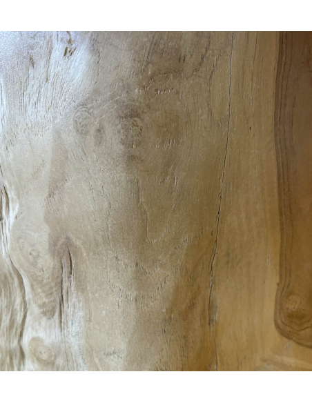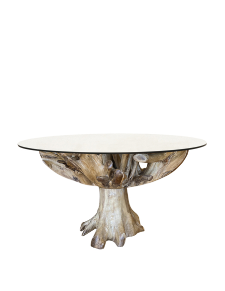 La mesa de comedor realizada en raíz de teka blanqueada, elegante y natural, llenará tu espacio de belleza a la par que de naturalidad. Sus formas sencillas sacadas del mismo árbol combinarán a la perfección con el resto de mobiliario y decoración que tengas en tu hogar, ya que sus formas naturales son muy versátiles y se adaptan a todos los estilos y ambientes. En su parte superior tiene un cristal de vidrio fácil de limpiar y cómoda para todos los comensales.