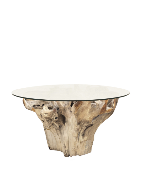 La mesa de comedor realizada en raíz de teka blanqueada, elegante y natural, llenará tu espacio de belleza a la par que de naturalidad. Sus formas sencillas sacadas del mismo árbol combinarán a la perfección con el resto de mobiliario y decoración que tengas en tu hogar, ya que sus formas naturales son muy versátiles y se adaptan a todos los estilos y ambientes. En su parte superior tiene un cristal de vidrio fácil de limpiar y cómoda para todos los comensales.