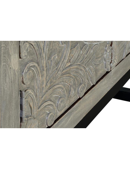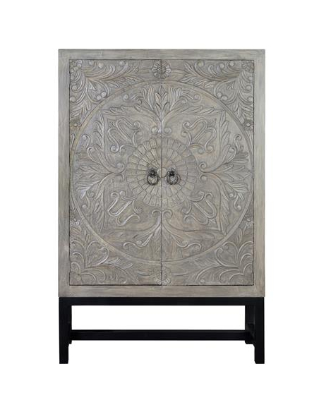 ¿Estás buscando una pieza diferente con capacidad? Tenemos la mejor opción con el armario vitrina en madera mango estilo étnico, un espectacular diseño para que guardes los objetos y pertenencias que desees tener organizadas. Un accesorio funcional para darle clase a tus espacios, donde lo coloques quedará de maravilla, un mueble con el frente tallado con estilos florales en color gris envejecido, patas de hierro en color negro y tiradores con forma de argolla. ¡Quedara impresionante donde lo coloques!