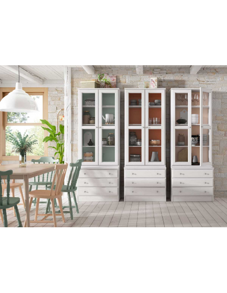 Vitrina alta Alba dos puertas y tres cajones. Totalmente personalizable en acabados barniz y lacados. Un mueble en madera de pino que podrás utilizar para organizar todo tipo de utensilios y objetos en tu hogar.