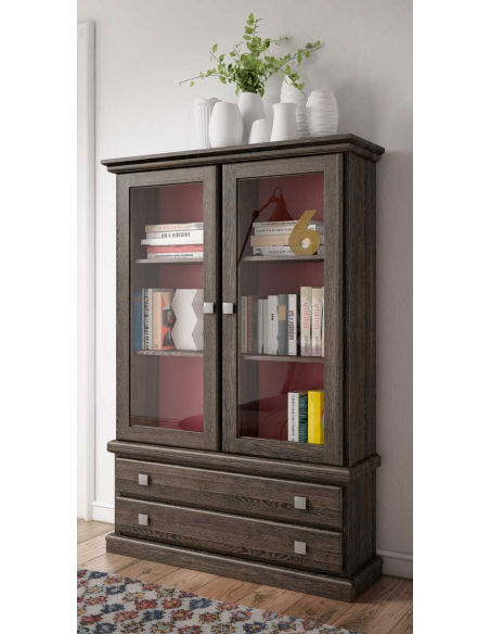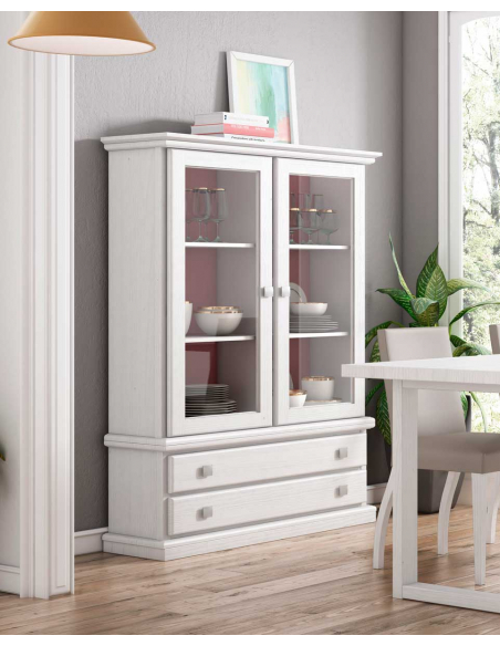 Elegante Vitrina baja Maya de 106 cm, un mueble de gran versatilidad, con los mejores acabados y en calidad de madera maciza de pino. Gracias a los diversos acabados disponibles en nuestro muestrario, podrás personalizar tu vitrina Maya con los colores que más te inspiren, para hacer de tu salón una estancia de la que sentirte orgullos@. Con una estructura práctica de estilo clásico, se compone por dos puertas expositoras en la parte superior y dos cajones en la parte inferior. Vajilla, cristalería, revistas, juegos, tú eliges lo que vas a guardar en tu nuevo vitrina Provenzal.