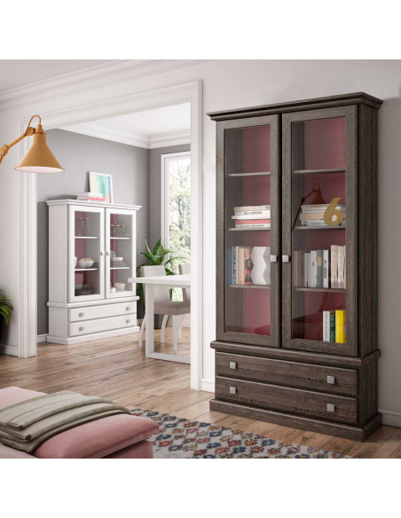 Elegante Vitrina alta Maya de 106 cm, un mueble de gran versatilidad, con los mejores acabados y en calidad de madera maciza de pino. Gracias a los diversos acabados disponibles en nuestro muestrario, podrás personalizar tu vitrina Maya con los colores que más te inspiren, para hacer de tu salón una estancia de la que sentirte orgullos@. Con una estructura práctica de estilo clásico, se compone por dos puertas expositoras en la parte superior y dos cajones en la parte inferior. Vajilla, cristalería, revistas, juegos, tú eliges lo que vas a guardar en tu nuevo vitrina Provenzal.