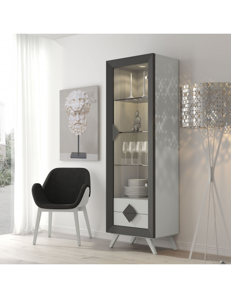 Vitrina vertical una puerta con cajones personalizable para que tengas la pieza que más se adapte a tu hogar y tus necesidades. Se trata de una colección de madera terminada con los mejores materiales, de alta calidad y entre los que podrás elegir varios acabados. Y si necesitas cualquier otro acabado o medidas puedes contactar con nosotras para crear la pieza de tus sueños.