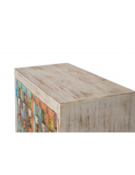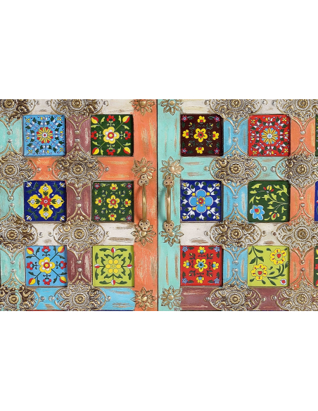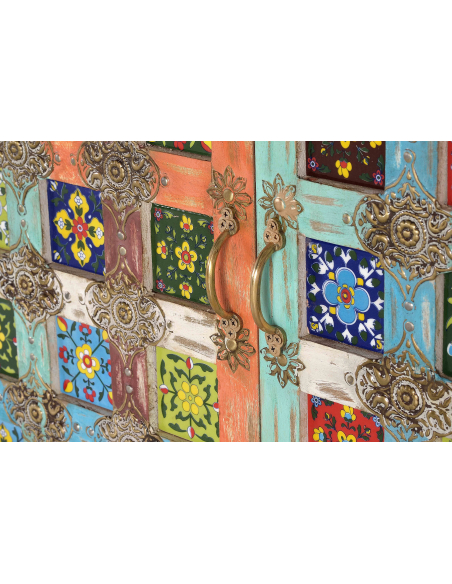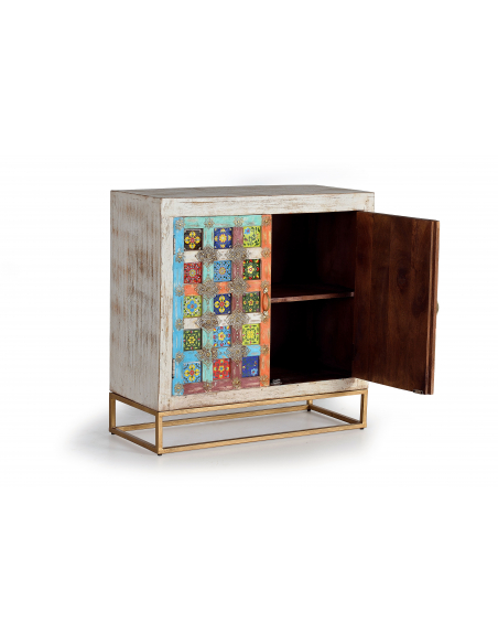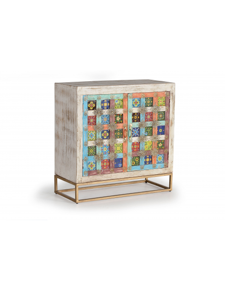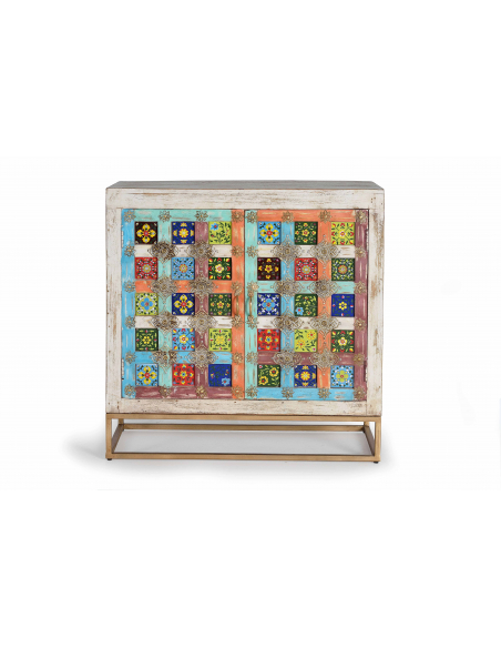 Aparador dos puertas multicolor base metal. Aparador con detalles del frente en cerámica de distintos colores lo cual le da un toque animado y alegre. La estructura en metal dorado le aporta estabilidad y peso visual.