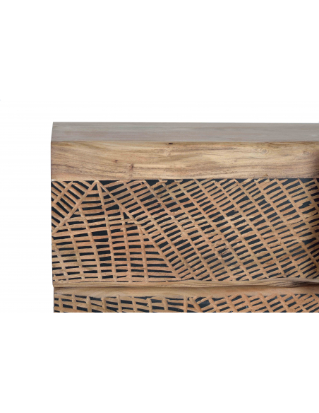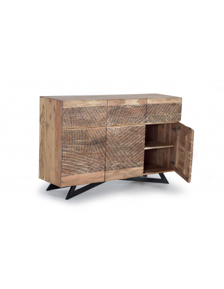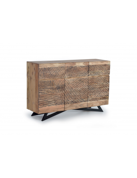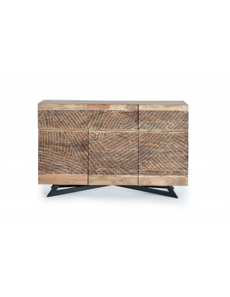 Aparador tres puertas en acacia tallado a mano. Aparador con tres puertas en madera de acacia y metal en color negro en las tapas. Frentes tallados a mano creando un bonito dibujo.