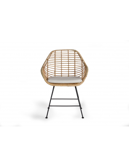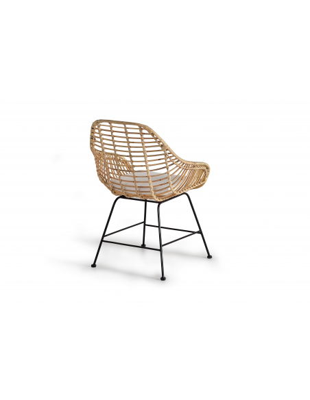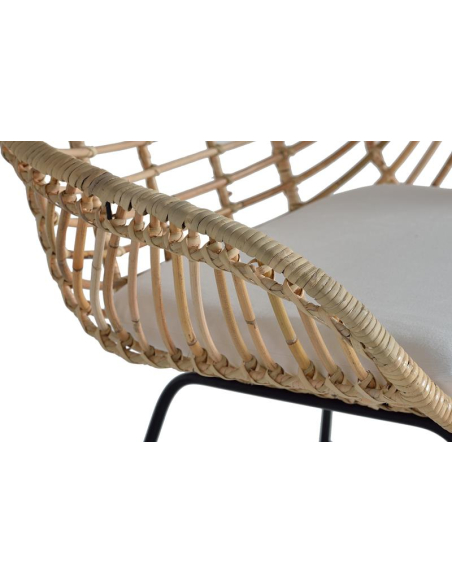 Set 2 sillas rattán y metal. Sillas rattán con estructura en metal de color negro y asiente en rattán natural con cojín en blanco.