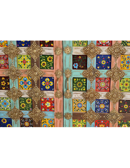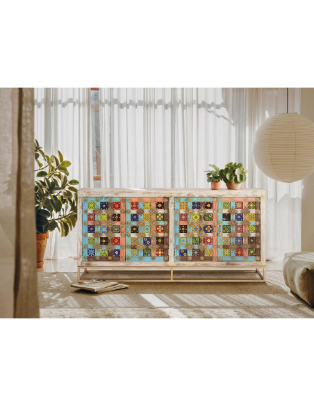 Aparador bufet Mosaico 4 puertas en madera de mango, detalles en azulejo y bronce.
