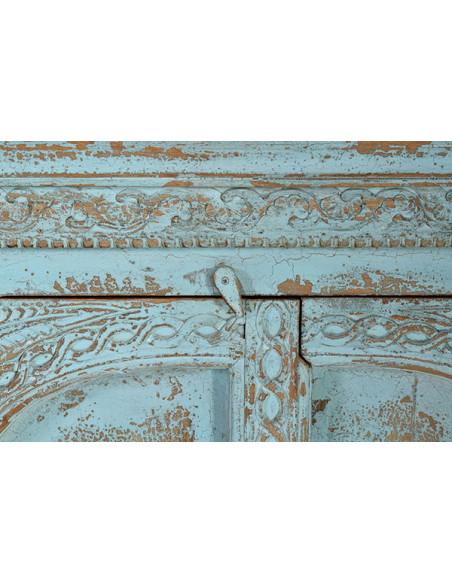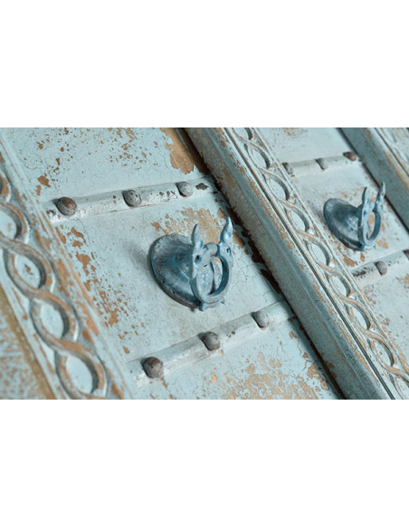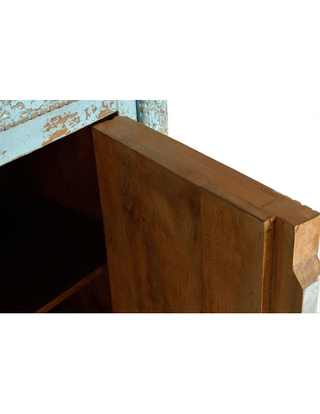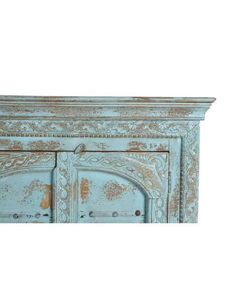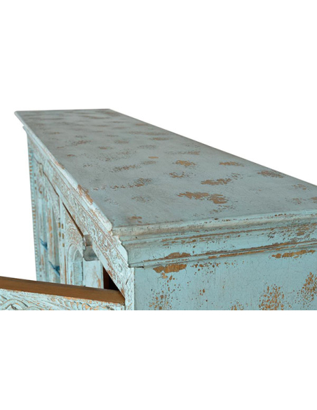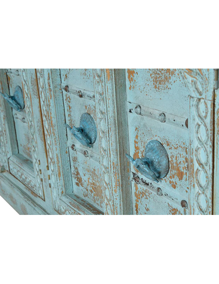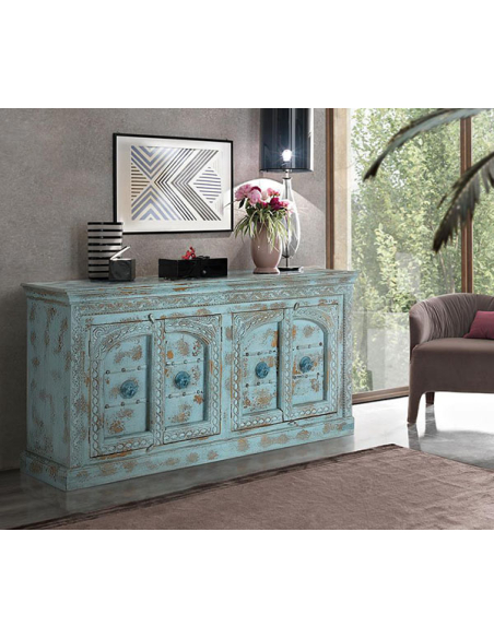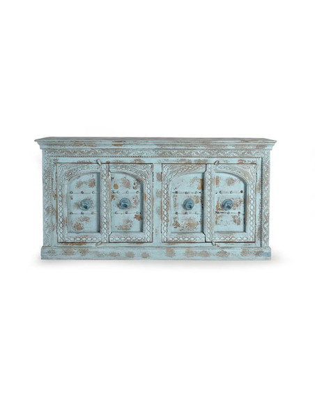 Aparador Azul 4 puertas en madera de mango, puertas talladas a mano con detalles en metal y estantes interiores.