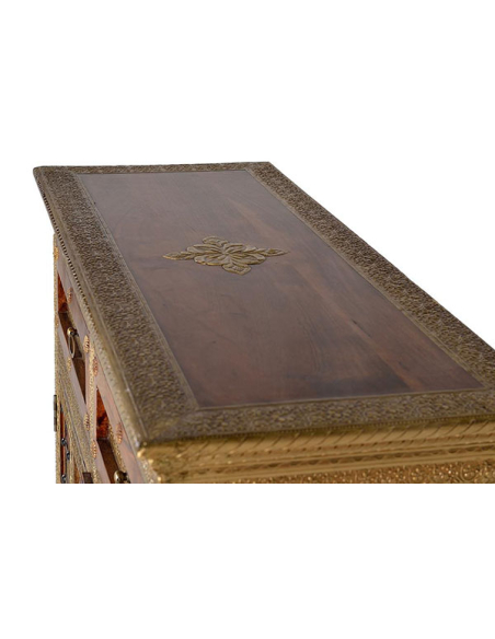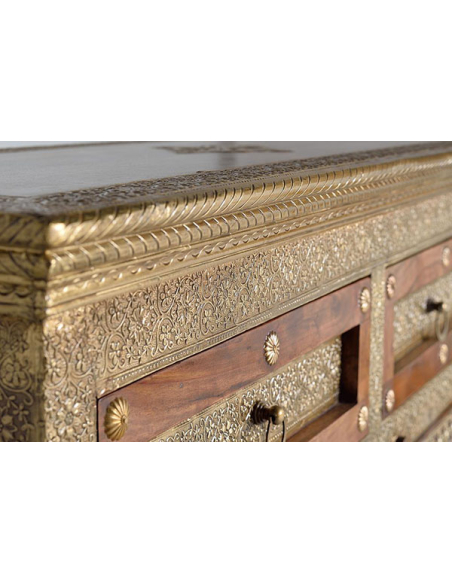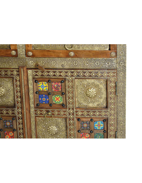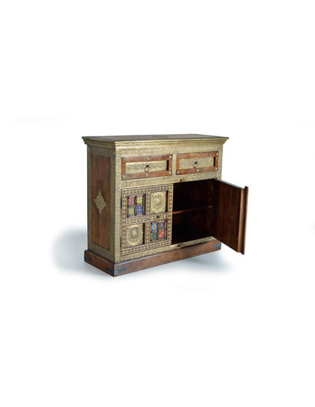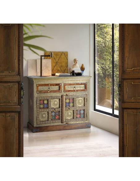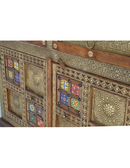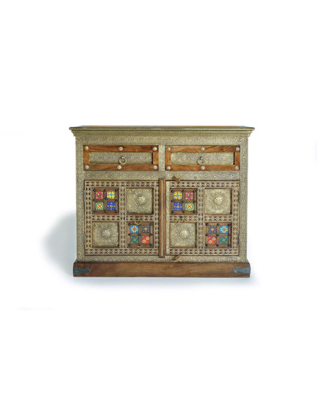 Aparador Cantón de estilo étnico en madera de acacia maciza con aplicaciones en azulejo y bronce repujado con dos cajones y dos puertas.