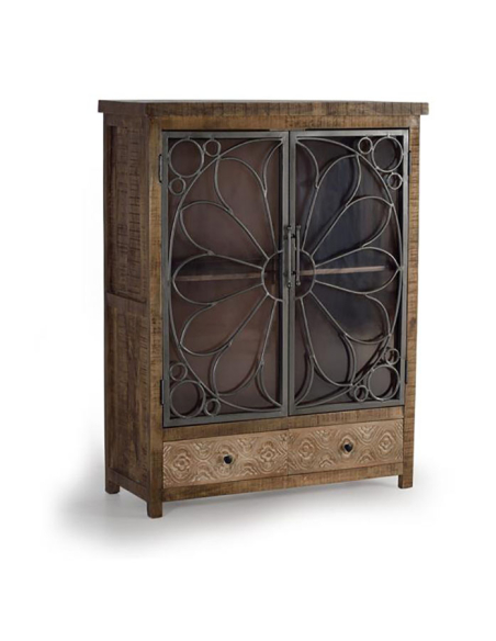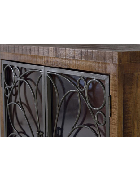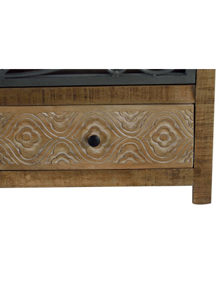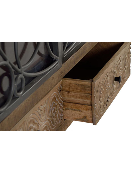 Vitrina Nagoya 2 cajones y 2 puertas de metal fabricado en madera de mango, con estante interior. Acabado envejecido.