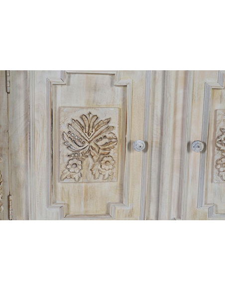 Aparador 2 puertas y 2 cajones en madera de mango, tallado a mano y con estantes interiores.