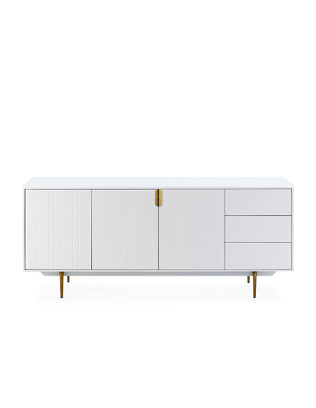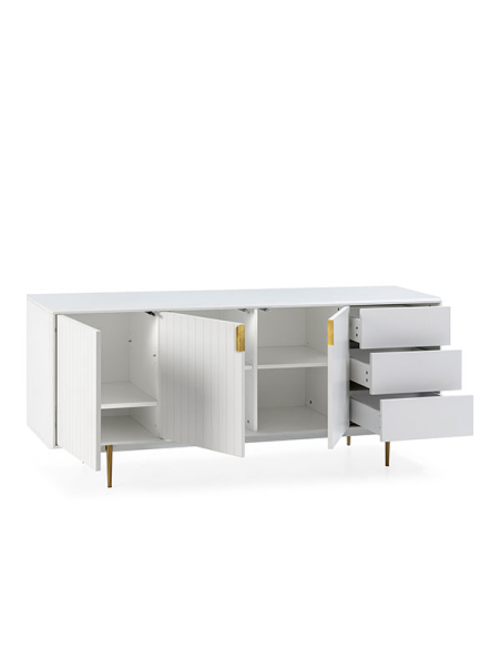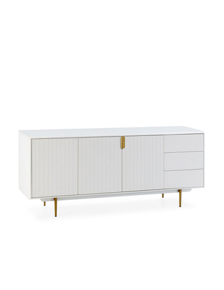 Aparador bajo Candem blanco satinado. Este aparador es el complemento perfecto para cualquier hogar. Fabricado en laminado color blanco satinado con los tiradores y las patas en color dorado, Detalle del frente estriado que le aporta un toque moderno y de plena actualidad. Tres puertas con diferentes estantes y tres cajones en un lateral confieren este aparador en un mueble muy funcional. Diseño elegante y moderno que añadirá un toque de distinción al salón.