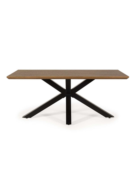 Mesa de Comedor DT-619 rectangular fija con patas de metal color negro y encimera en laminado de nogal. Destaca por su diseño contemporáneo y elegante. Las patas metálicas de color negro añaden un toque sofisticado y moderno, mientras que la encimera de laminado de nogal proporciona calidez y encanto natural.
