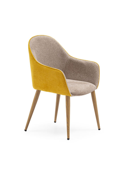 Set 2 Sillas de Comedor DC-625 con brazos tapizadas en polipiel combinada en color mostaza-beige y patas metálicas en acabado madera color roble. Estas sillas ofrecen un diseño sofisticado y acogedor que añadirá estilo y comodidad a tu espacio de comedor.