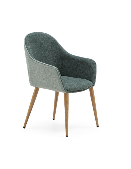 Set 2 Sillas de Comedor DC-625 con brazos tapizadas en polipiel combinada en color verde y patas metálicas en acabado madera color roble. Estas sillas ofrecen un diseño sofisticado y acogedor que añadirá estilo y comodidad a tu espacio de comedor.