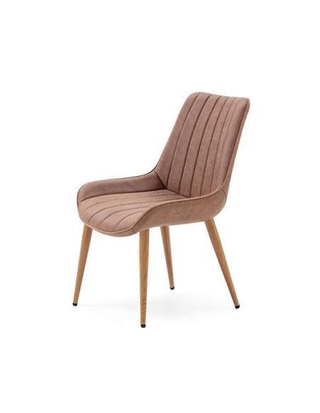 Set 4 Sillas de Comedor DC-627 tapizadas en polipiel color marrón con patas metálicas en acabado roble. Con su tapizado en polipiel y patas metálicas en acabado roble, estas sillas ofrecen un diseño moderno y versátil que se adaptará a la perfección a tu espacio. Su estética sencilla y elegante permite combinarlas con muebles y ambientes variados. Las patas metálicas en acabado roble ofrecen resistencia y estabilidad a las sillas, además de aportar un toque moderno y elegante al diseño. Estas sillas son ideales no solo para el comedor, sino que también pueden ser utilizadas en otros espacios de tu hogar, como la sala de estar o el estudio, para agregar asientos adicionales con estilo. Disponibles en marrón y gris.