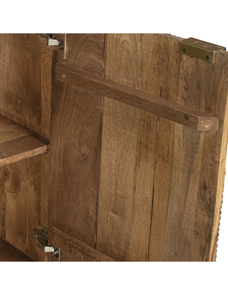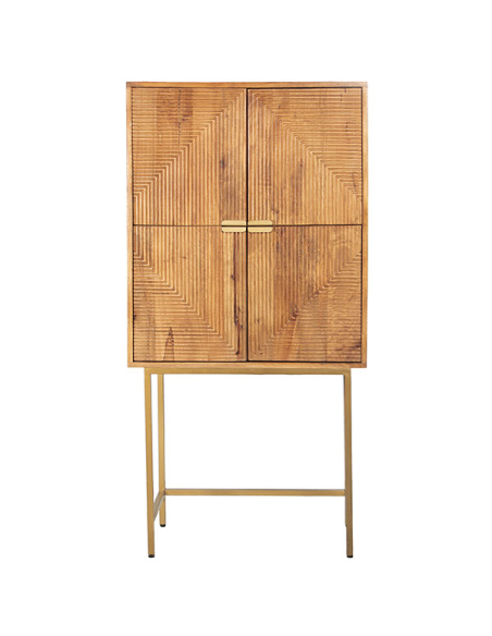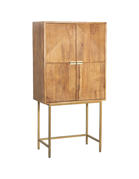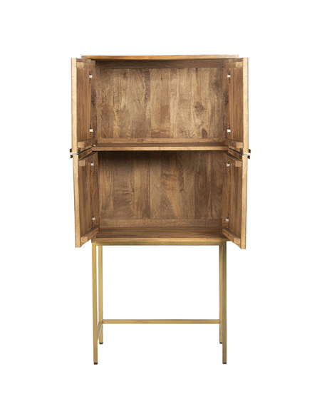 Aparador alto Nogales en madera de mango. Fabricado con las patas altas de metal en acabado dorado y con dos puertas y dos huecos en el interior para facilitar la colocación y ordenación de los objetos. La colección Nogales esta fabricada en madera de mango que le confiere robustez a las piezas, detalle estriado en los frentes y tiradores de metal dorados.
