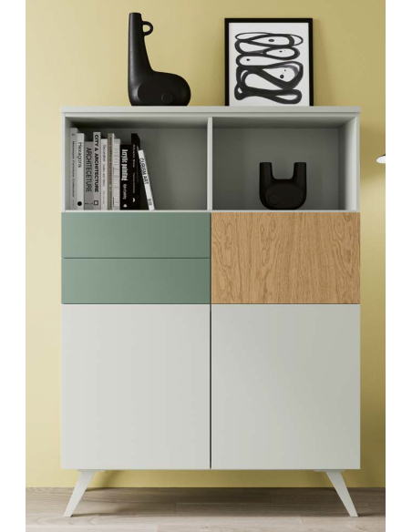 Modelo de la foto: Estructura y puertas inferiores lacado Perla, puerta superior Roble Nature, frente cajones lacado Agave, patas lacado Blanco.