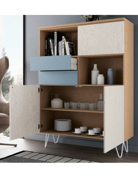 Un mueble compuesto por dos puertas en la parte inferior, dos cajones y un hueco en la parte central y hueco con puerta en la parte superior. Una pieza ideal para tener todo organizado en la zona de comedor, o poder colocarlo como cómoda en cualquier habitación de la casa.