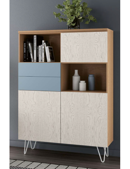 Modelo de la foto: Estructura en Roble Seda, puertas en Alaska, cajones lacado Celeste, patas metálicas Blanco.