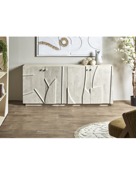 Aparador Musim madera de mango con relieve. Un aparador buffet perfecto para organizar, pero que también decora cualquier estancia. El aparador Musim cuenta con 4 puertas y destaca por sus relieves decorativos en madera de mango.