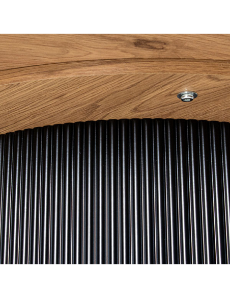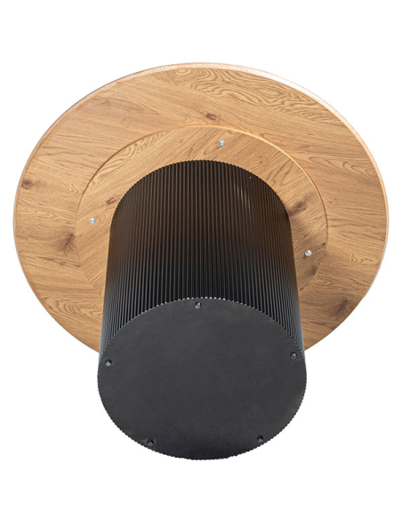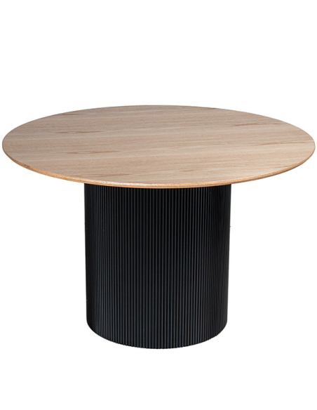 Mesa de comedor 120 cm madera roble y negro, tapa redonda color roble que transluce la textura de la madera. Base cilíndrica robusta que brinda excelente sostén para la tapa, la base color negro esta recubierta con una plancha en relieve de varillas verticales. La base esta sujeta a la tapa mediante tornillos metálicos de alta calidad que aseguran la durabilidad del producto. La elegancia del roble se fusiona armoniosamente con el negro, creando una pieza central que atraerá todas las miradas en tu comedor. Perfecta para reuniones familiares o cenas íntimas, esta mesa captura la esencia de la modernidad y la funcionalidad.